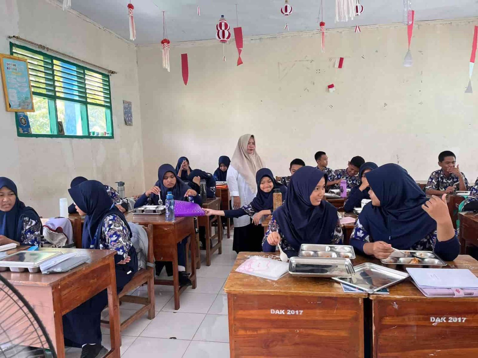 Program ini disambut dengan antusias oleh para siswa yang menikmati santapan bergizi di dalam kelas.