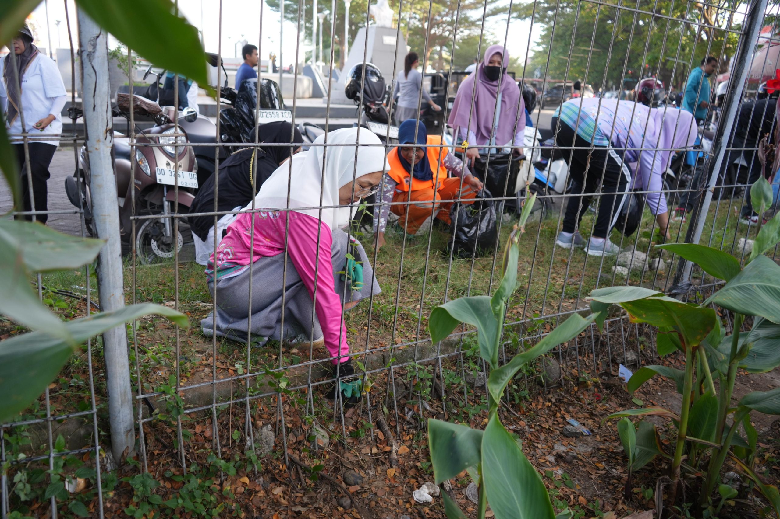 Dengan semangat kebersamaan, Melinda Aksa turun langsung membersihkan area taman dan trotoar, mencabut rumput liar, serta memungut sampah plastik yang berserakan di kawasan Pantai Losari.