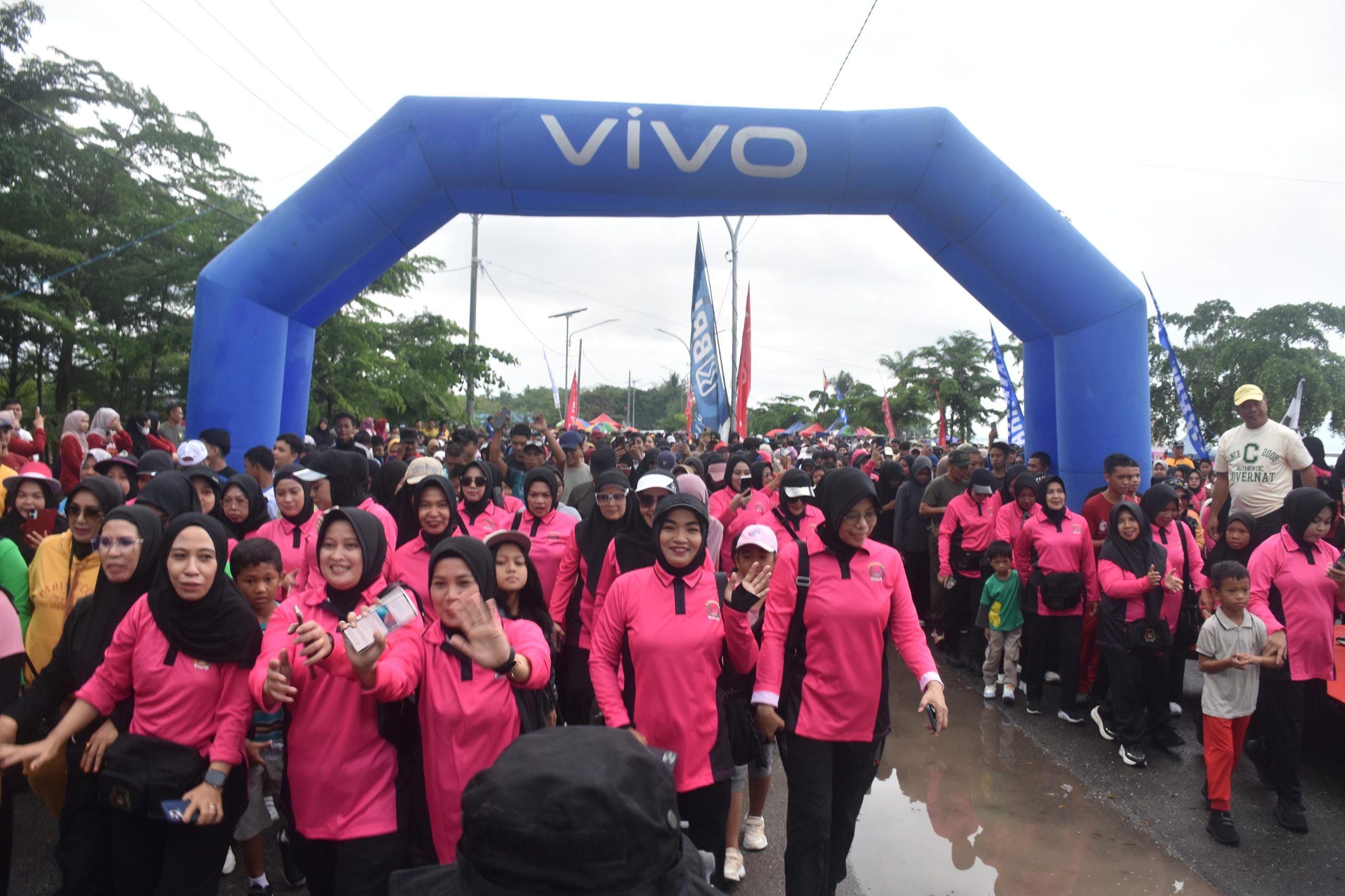 Meski sempat diguyur hujan, antusiasme masyarakat tetap tinggi. Ribuan peserta dari berbagai kalangan mulai memadati lokasi sejak pukul 06.00 WITA untuk mengikuti kegiatan jalan sehat bertema “Polri untuk Masyarakat”.