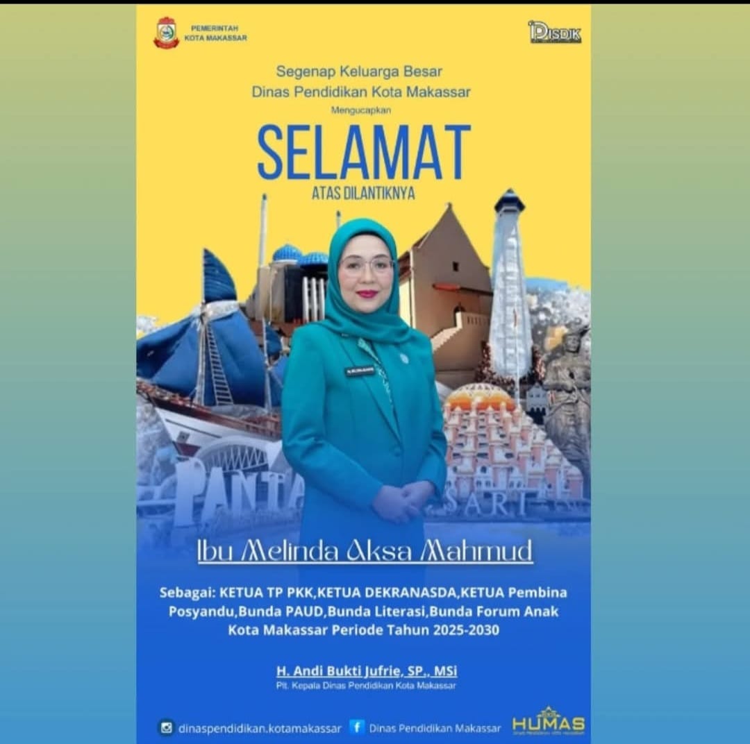 MAKASSAR, LINKSATUSULSEL.COM– Segenap keluarga besar Dinas Pendidikan Kota Makassar dengan penuh kebanggaan mengucapkan selamat atas pelantikan Ibu Melinda Aksa sebagai Ketua TP PKK, Ketua Dekranasda, Ketua Pembina Posyandu, Bunda PAUD, Bunda Literasi, dan Bunda Forum Anak Kota Makassar untuk periode 2025-2030.