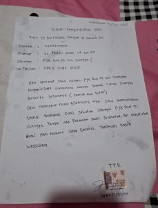 “Dari hasil pertemuan malam kemarin di saksikan beberapa warga serta PJ RW sendiri telah membuat pernyataan di atas materai tentang pengunduran diri WH.