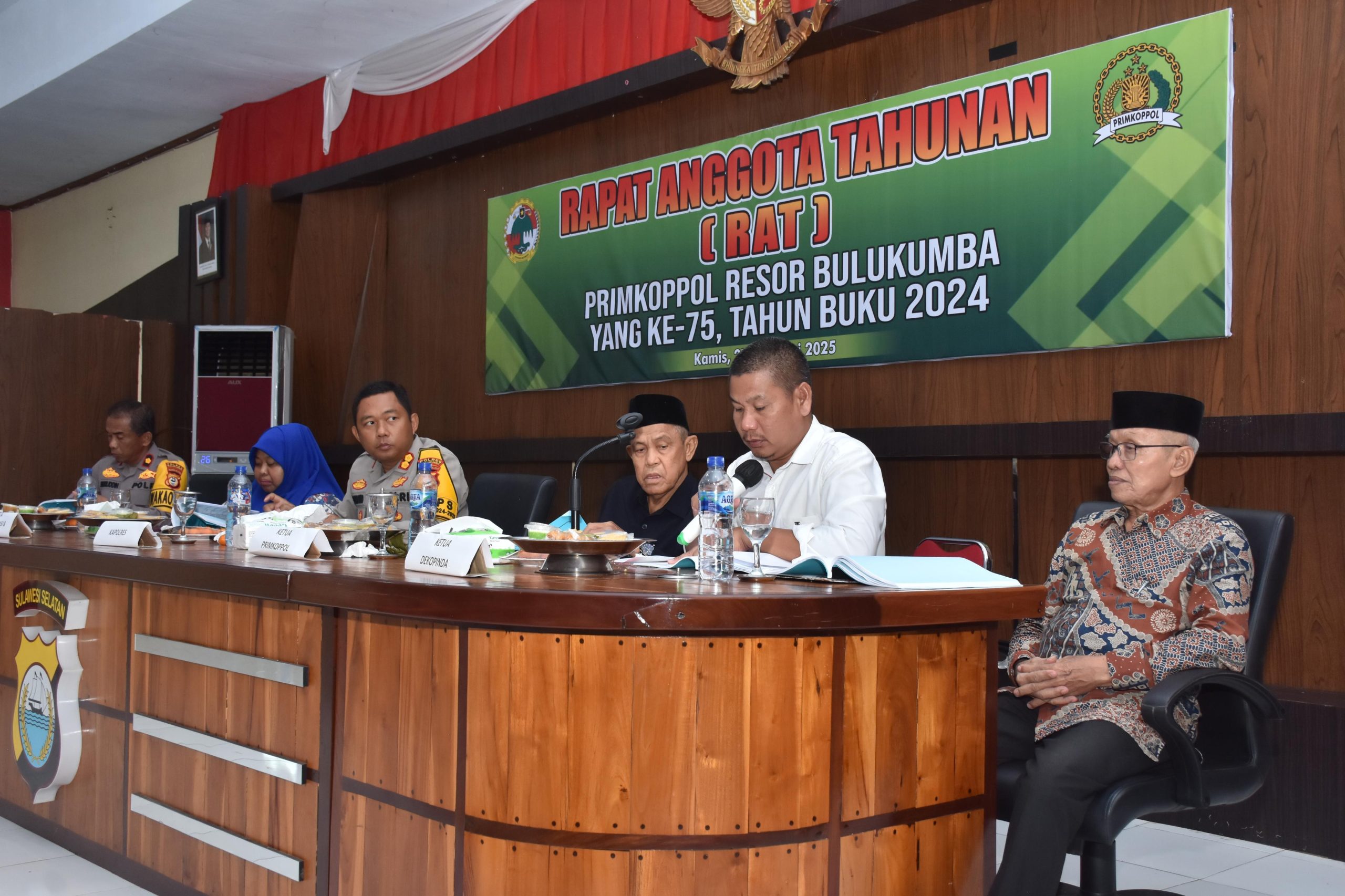 BULUKUMBA, LINKSATUSULSEL.COM — Primer Koperasi Kepolisian (Primkoppol) Polres Bulukumba menyelenggarakan Rapat Anggota Tahunan (RAT) yang Ke-75 Tahun Buku 2024 di Aula Parama Satwika Polres Bulukumba, Kamis (27/2/2025). RAT ini dibuka langsung oleh Kapolres Bulukumba AKBP Andi Erma Suryono, S.H.,S.I.K.,M.M.