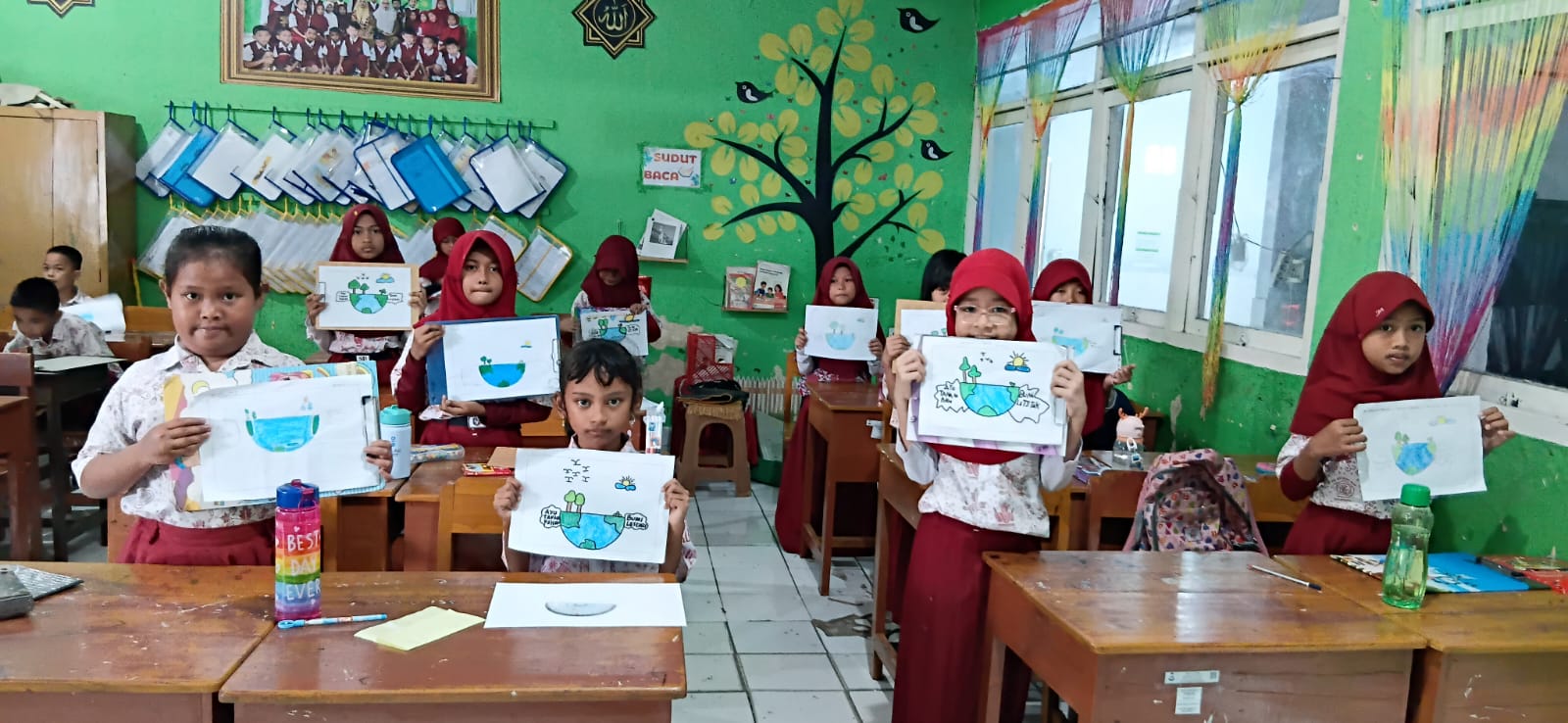 – Kelas 1: Mewarnai gambar bertema bumi. Melalui kegiatan ini, siswa diajak mengenal keindahan bumi dan pentingnya menjaga alam sejak dini.