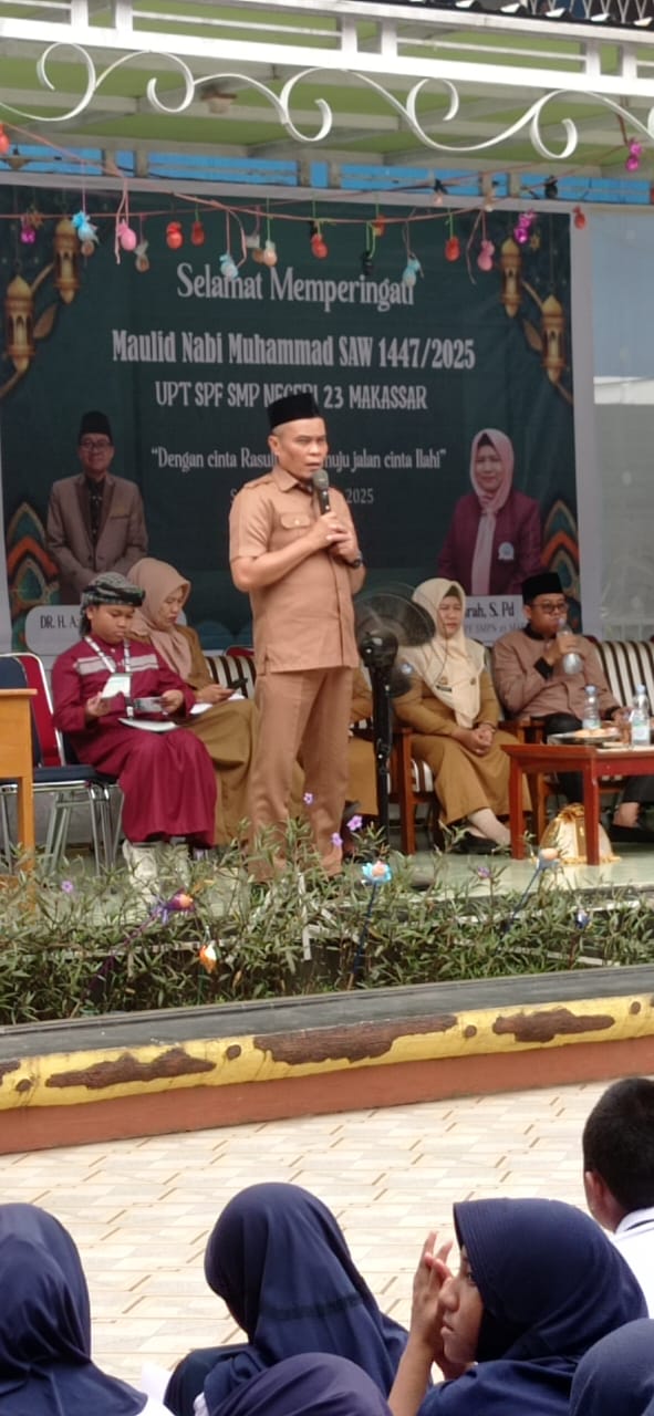 Potret UPT SPF SMPN 23 Makassar perayaan Maulid Nabi Muhammad SAW 12 Rabiul Awal 1447 H, Senin 15 September 2025 dihadiri sejumlah pejabat Dinas Pendidikan, Pengawas Sekolah, Komite Sekolah, guru-guru dan sejumlah orang tua siswa.