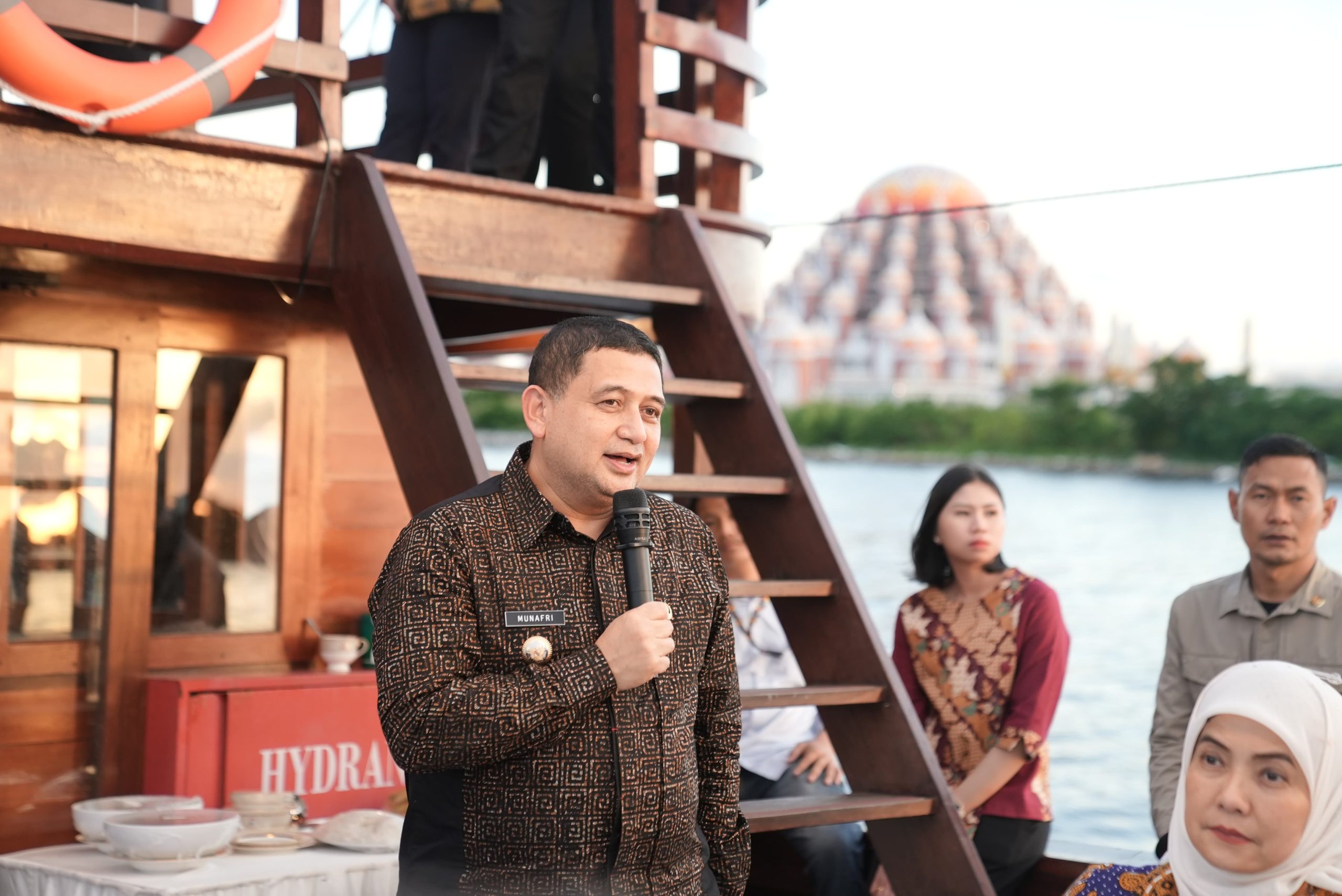 Santap makan malam dilakukan di atas Kapal Pinisi, tetamu yang hadir juga diajak menikmati keindahan sunset di Pantai Losari Kota Makassar.