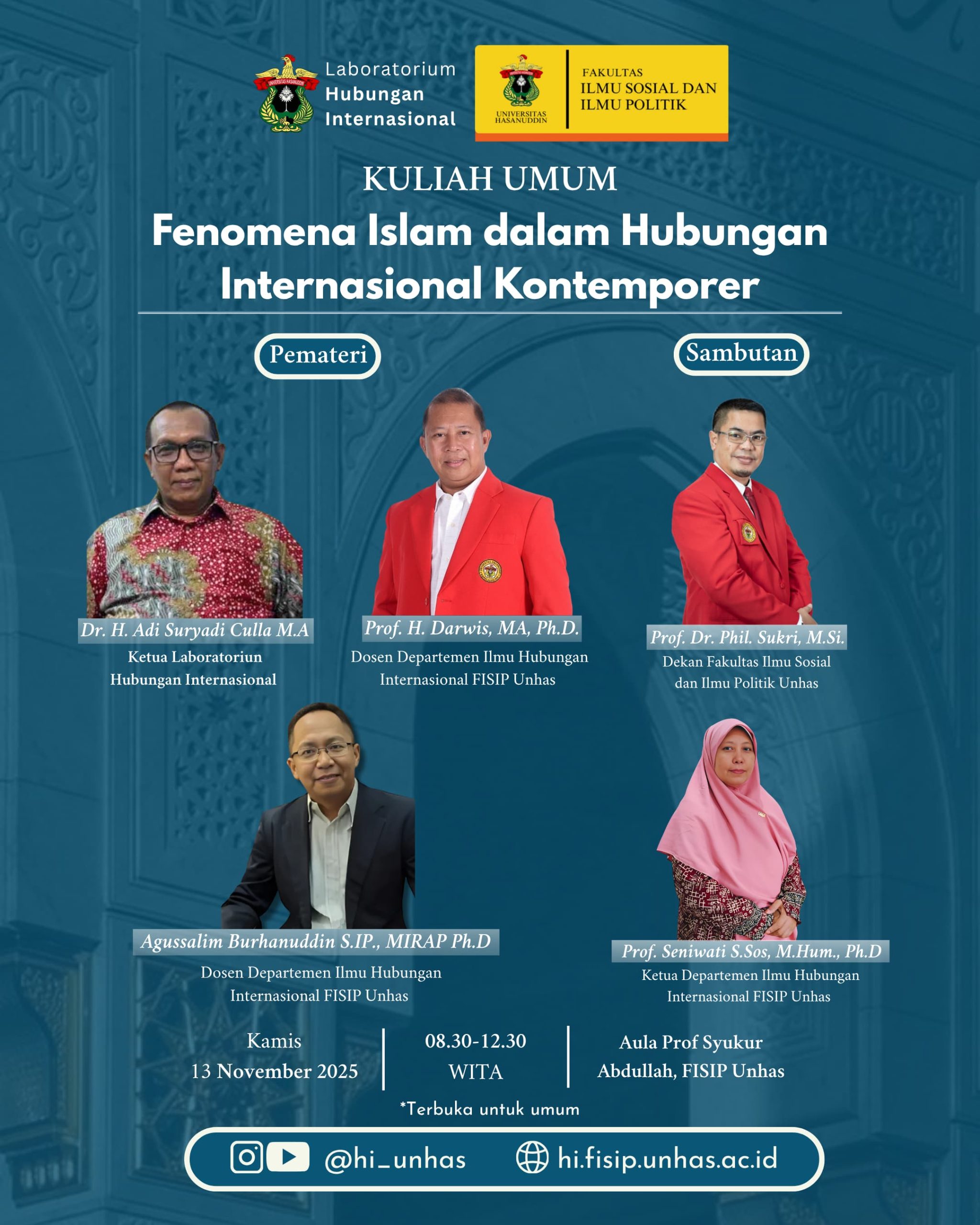 MAKASSAR, LINKSATUSULSEL.COM — Program Studi Ilmu Hubungan Internasional Fakultas Ilmu Sosial dan Ilmu Politik (FISIP) Universitas Hasanuddin sukses menyelenggarakan kuliah umum bertajuk “Fenomena Islam dalam Hubungan Internasional Kontemporer” . Kegiatan tersebut berlangsung di Aula Prof. Syukur Abdullah, FISIP Unhas, Kamis (13/11/2025).