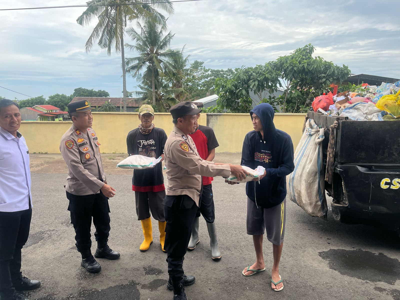 Setelah dihentikan AKP Syamsul Bahri didampingi IPTU Muhammad Ali Kasat Reskrim langsung menyalurkan 5 Kg Beras kepada masing-masing petugas kebersihan tersebut.