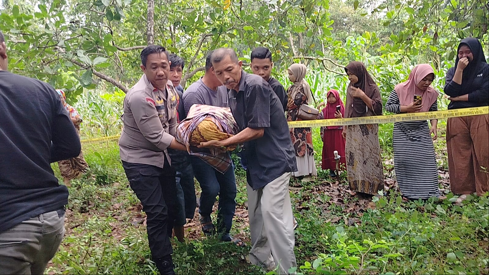 Setelah proses identifikasi dan olah TKP, evakuasi dilakukan oleh Kapolsek bersama warga dan personel Polsek Bontotiro menggunakan mobil dinas Polri ke rumah duka.
