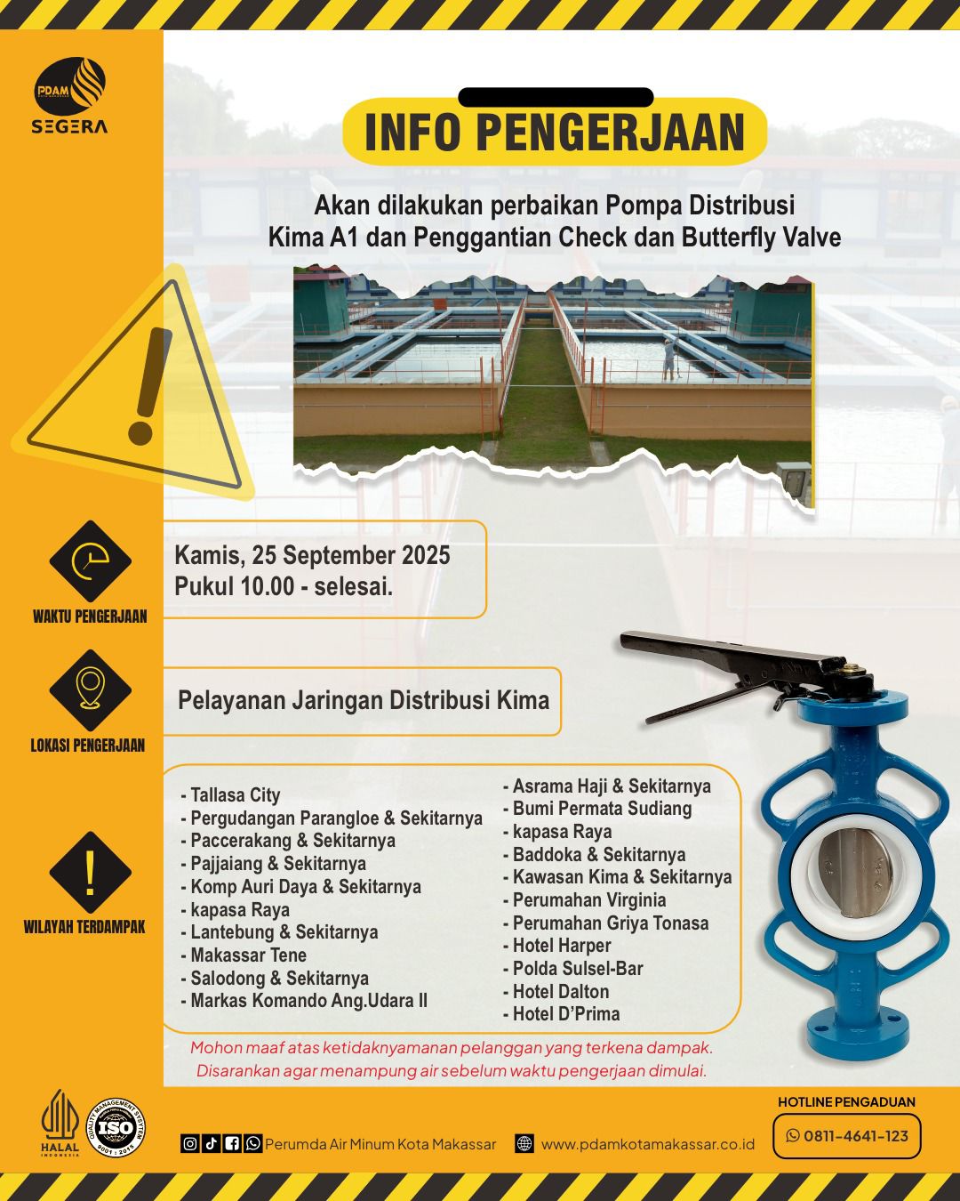 MAKASSAR, LINKSATUSULSEL.COM— Perumda Air Minum Kota Makassar akan melakukan perbaikan pompa distribusi Kima A1 serta penggantian check dan butterfly valve pada Kamis, 25 September 2025, mulai pukul 10.00 Wita hingga selesai. Pengerjaan ini berdampak pada penurunan tekanan distribusi air di sejumlah wilayah layanan Kima.