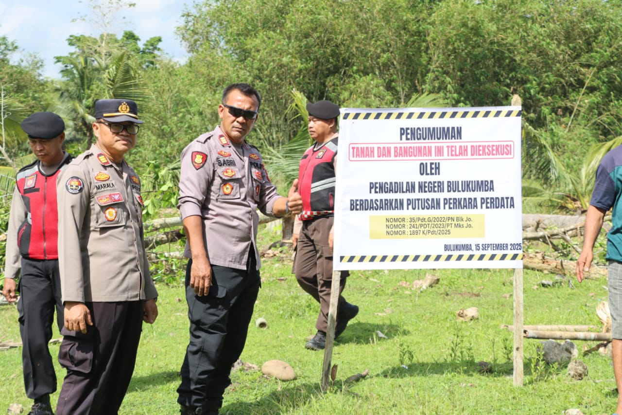 BULUKUMBA, LINKSATUSULSEL.COM – Polres Bulukumba Polda Sulsel melaksanakan pengamanan eksekusi sebidang tanah perumahan/kebun di Dusun Kalumpang, Desa Lembang, Kecamatan Kajang, Kabupaten Bulukumba, Senin (15/09/2025) pagi.