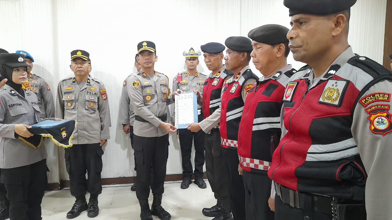 LUTIM, LINKSATUSULSEL.COM–Kapolres Luwu Timur AKBP Silvester MM Simamora, S.I.K, MH, melakukan Penyerahan Piagam Penghargaan Kepada Personel Sat Samapta Polres Luwu Timur atas dedikasi dan loyalitas yang tinggi dalam melaksanakan program inovasi problem solving Sat Samapta, dan meraih peringkat pertama Se – Polda Sulawesi Selatan.